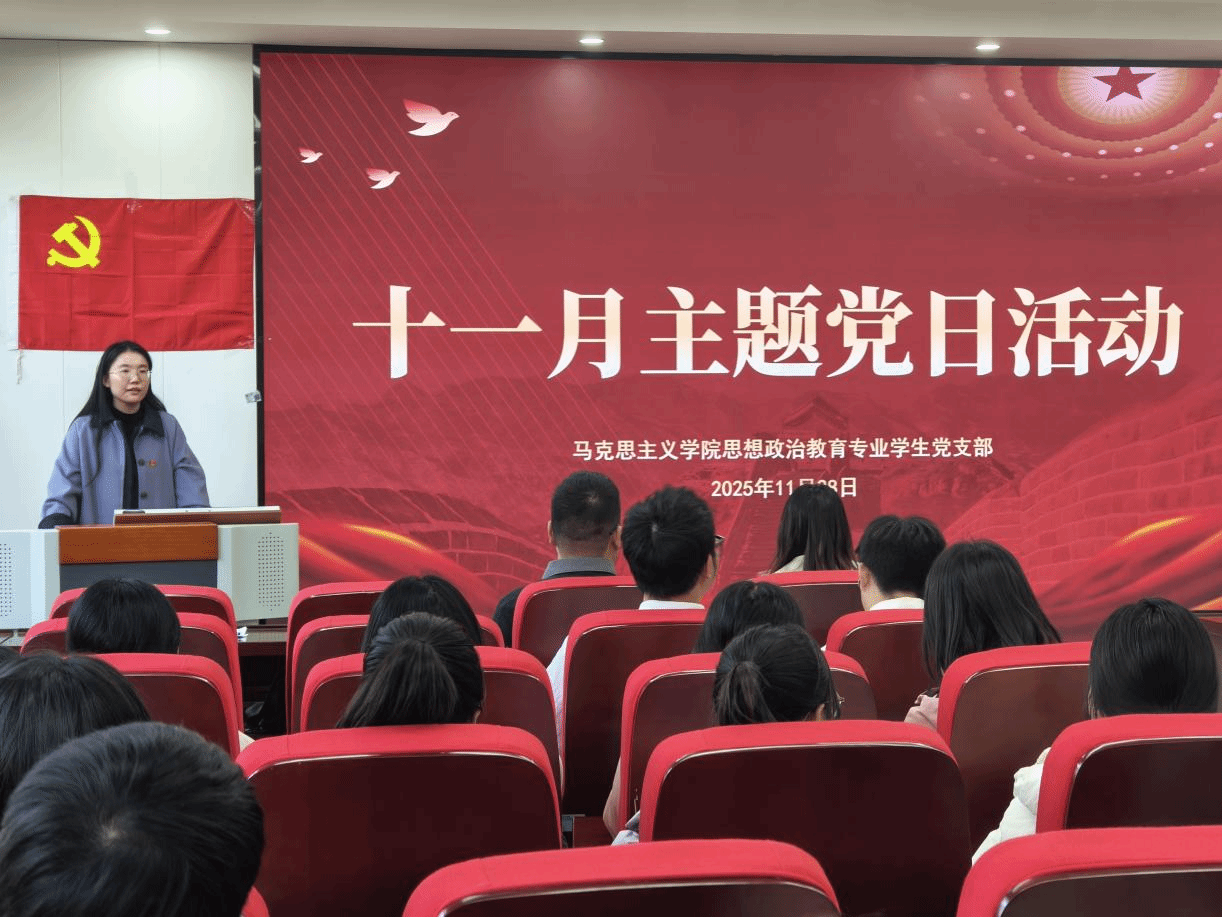 为深入学习贯彻党的创新理论,进一步筑牢学生党员思想根基,汇聚成长成才力量,2025年11月28日,马克思主义学院思想政治教育专业学生党支部在硕勋楼903开展十一月主题党日活动。本次党日活动由党支部书记刘国琴主持,全体党员参会。