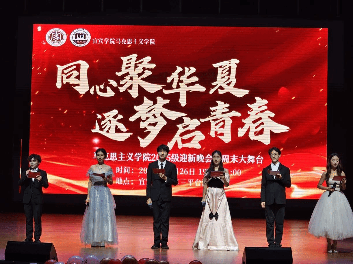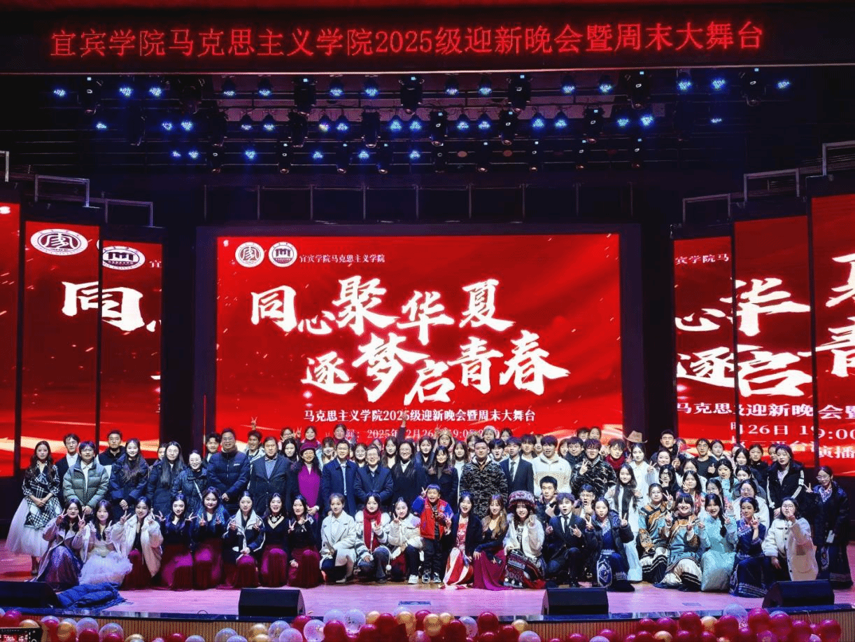 为欢迎2025级新同学,增进全院师生情谊,展现马院学子的青春风采,2025年12月26日晚,宜宾学院马克思主义学院在A区演播厅举办“同心聚华夏,逐梦启青春”迎新晚会暨周末大舞台活动。马克思主义学院党委书记竭仁贵、副院长夏高发、党委副书记郑万敏、副处级组织员黄红,各班班主任及班导师们与马院2023级、2024级、2025级全体同学共同参加本次晚会。