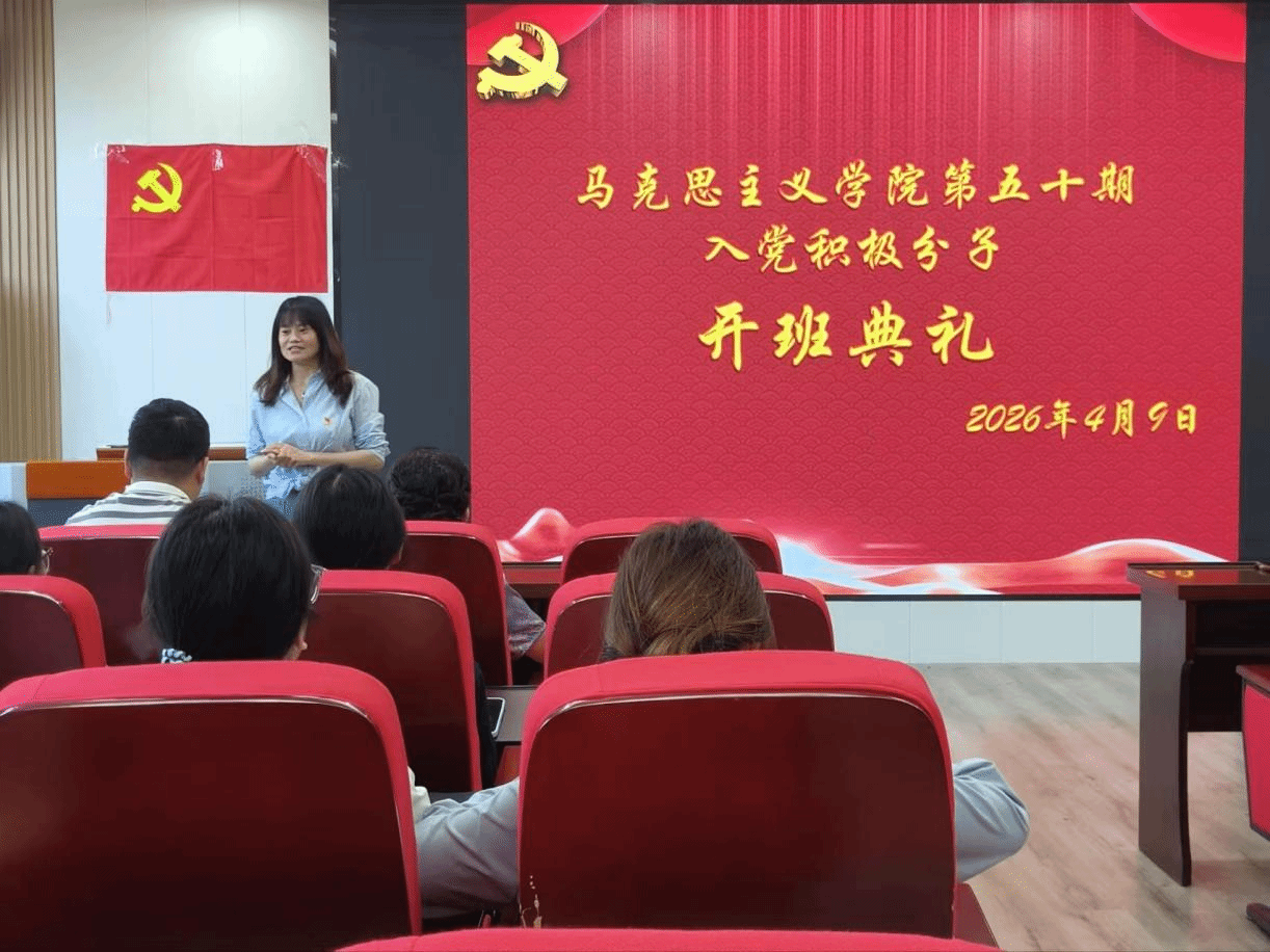 为加强学生党员队伍建设,抓实入党积极分子培养教育,持续提升青年学子思想政治素养,马克思主义学院思想政治教育专业学生党支部于2026年4月9日下午在硕勋楼903举行第五十期入党积极分子培训班开班典礼。本次活动由学生党支部书记刘国琴主持,学院副处级组织员黄红、学生党支部教师党员及第五十期入党积极分子全体参加。