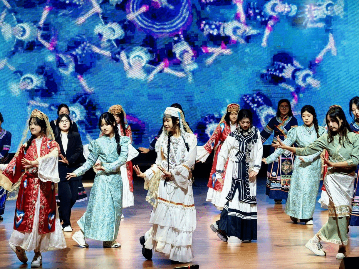 晚会以开场舞《相亲相爱》热情点燃,围绕“缘聚·华夏同心”“绽放·青春同行”“筑梦·时代同歌”三大篇章展开。舞台剧《舞林争霸》堪称本次晚会的一大亮点,以别出心裁的编排与生动演绎,展现出马院学子的蓬勃创造力与青春活力;朗诵《石榴籽一家亲》用真挚言语诉说民族团结的深厚情谊,把“民族团结一家亲”的理念融入舞台,赢得阵阵掌声。此外,走秀《霓裳漫卷 民族风华》、配音《幸福“开”声》等节目同样精彩纷呈,共同勾勒出一幅青春洋溢、团结向上的动人画卷。