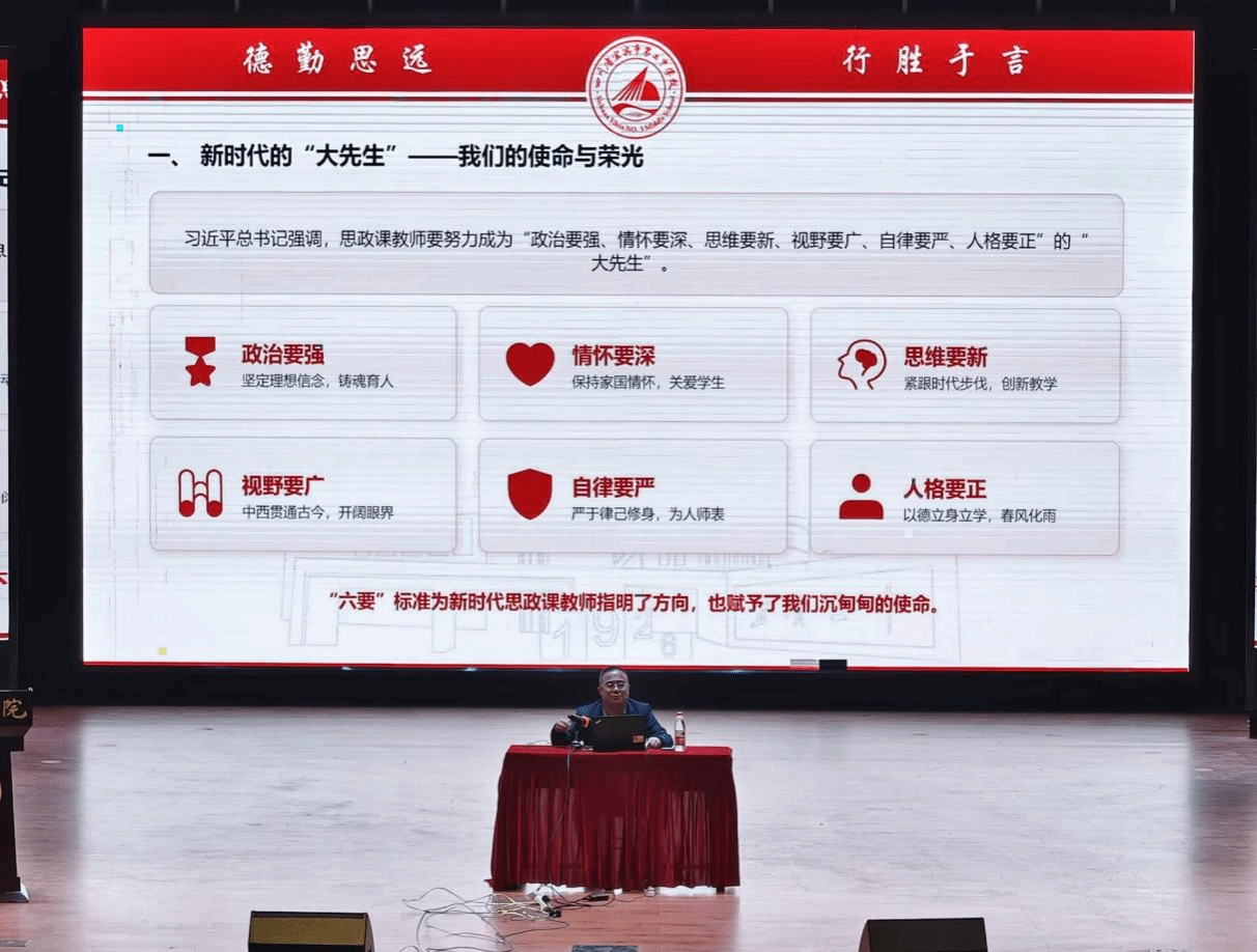 谈及思政教师的使命与担当,李昊校长结合自身多年教学实践,分享了在议题式教学、情景化课堂等方面的创新探索与实践经验。他强调,思政课的生命力在于入脑入心,思政教师不能做照本宣科的教书匠,而应成为学生价值塑造的引路人。他勉励同学们牢记习近平总书记对思政课教师提出的“六要”要求,努力做到政治强、情怀深、思维新、视野广、自律严、人格正,坚定政治信仰,厚植教育情怀,在未来的讲台上努力成长为新时代的“大先生”。整场分享内容翔实、贴近学生实际,现场互动热烈,引发了师生的广泛共鸣。