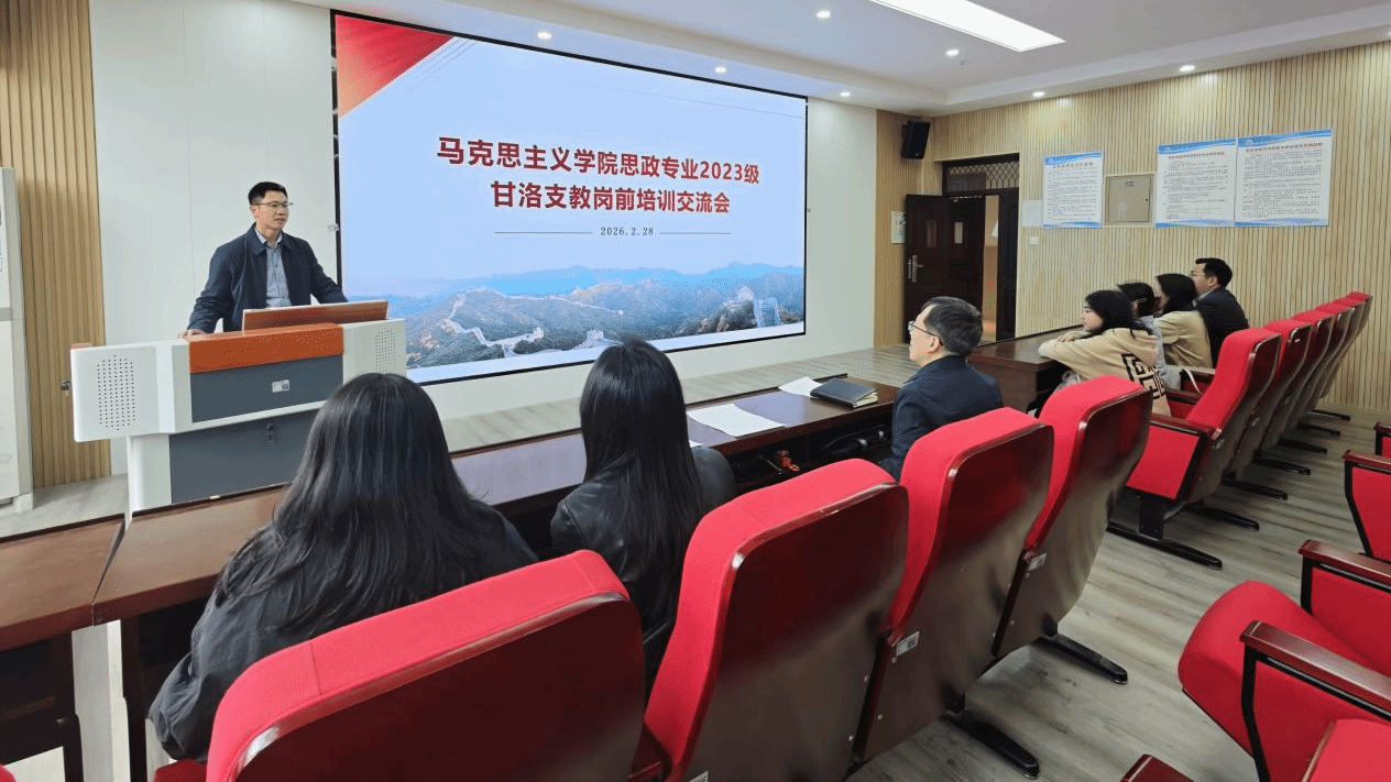 2月28日下午,2026年春期甘洛顶岗支教培训会在硕勋楼901教室举行,马克思主义学院党委书记竭仁贵、副院长(主持工作)夏高发、副书记郑万敏、各科室负责人和新学期支教的3位同学参会。