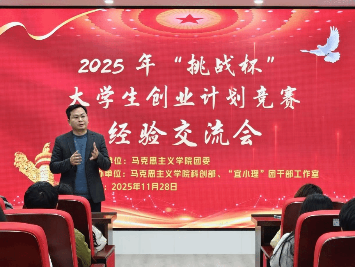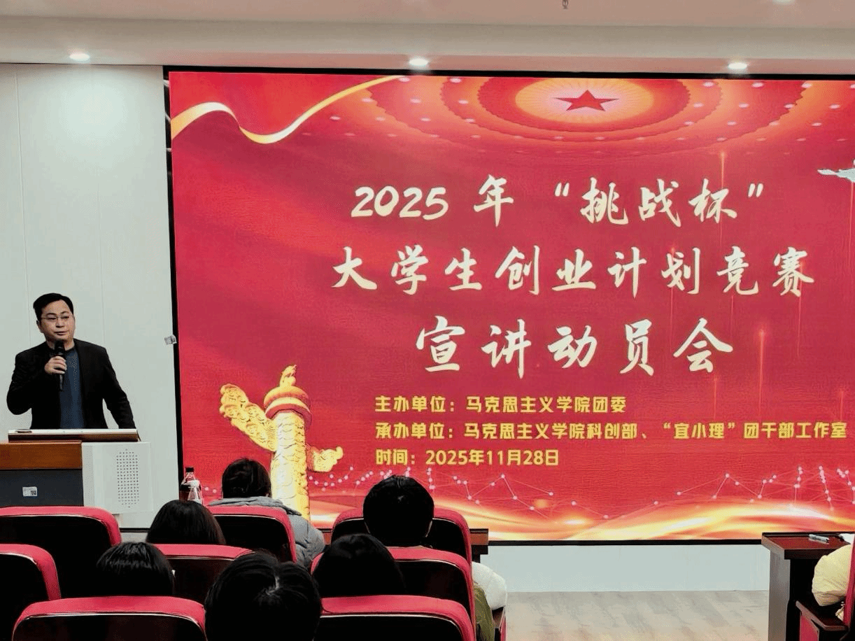 为激发学生参与学科竞赛的热情与动力,11月28日,由宜宾学院马克思主义学院科创部主办、“宜小理”团干部工作室承办的2025年“挑战杯”竞赛宣讲动员暨经验交流会在硕勋楼901教室举办。实践创新办主任王槐银,优秀团队代表杨星岩以及马克思主义学院“挑战杯”参赛队伍成员参与本次活动。