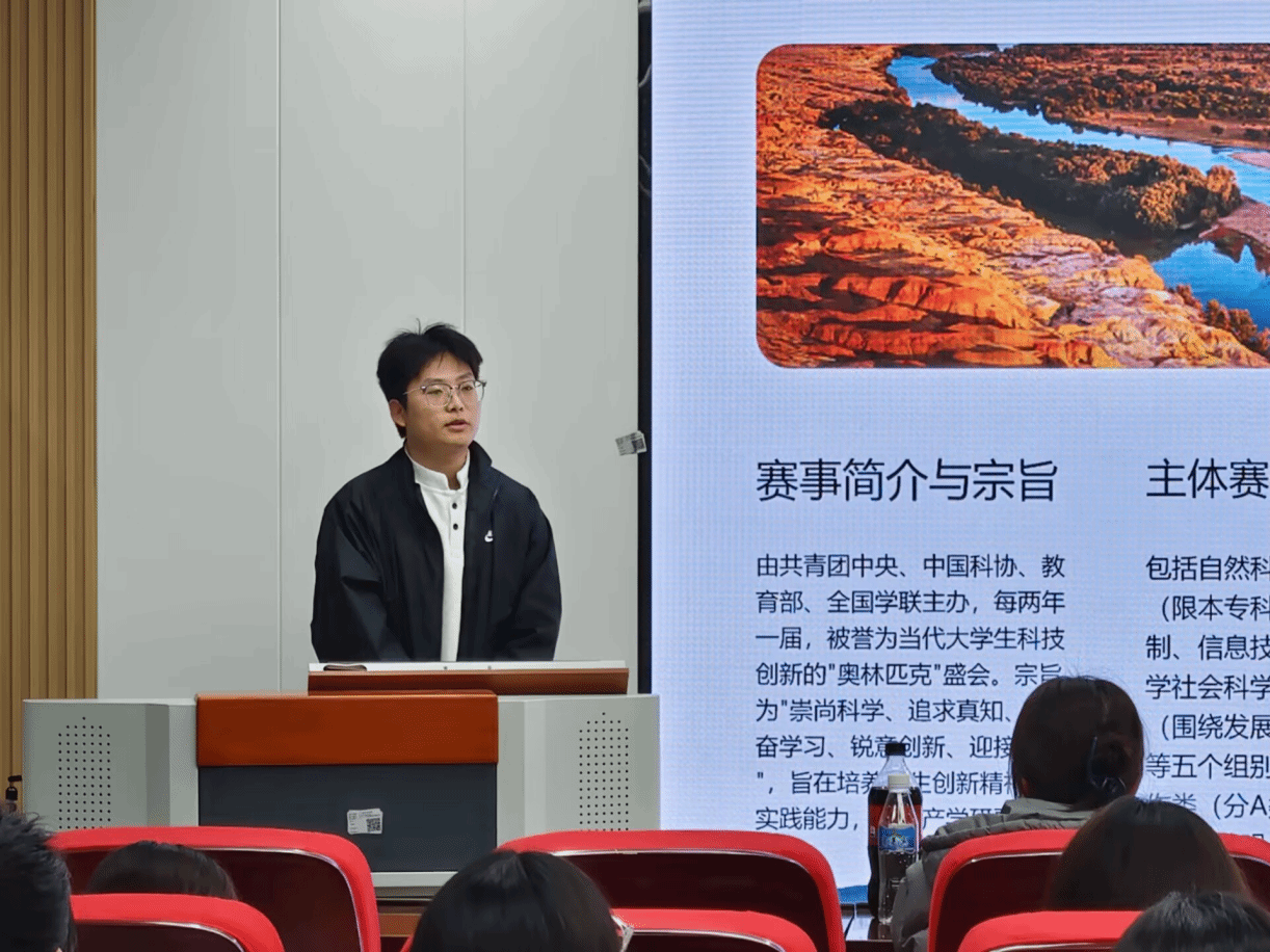 活动伊始,王槐银老师对“挑战杯”赛事体系进行了系统解读,围绕各赛道的组别设置、赛程安排及评审标准等核心内容,展开了详细介绍。他指出,“挑战杯”系列赛事作为全国性大学生科创平台,对培养学生创新思维、锻炼实践能力具有重要意义,并鼓励同学们珍惜参赛机会,勇于尝试、积极创新。同时,王槐银老师特别强调了学术规范的重要性,提醒同学们严守科研诚信底线,杜绝抄袭等违规行为,始终以严谨诚信的态度参与竞赛。